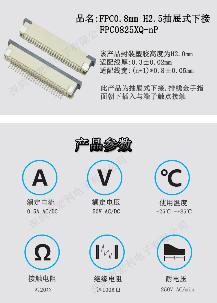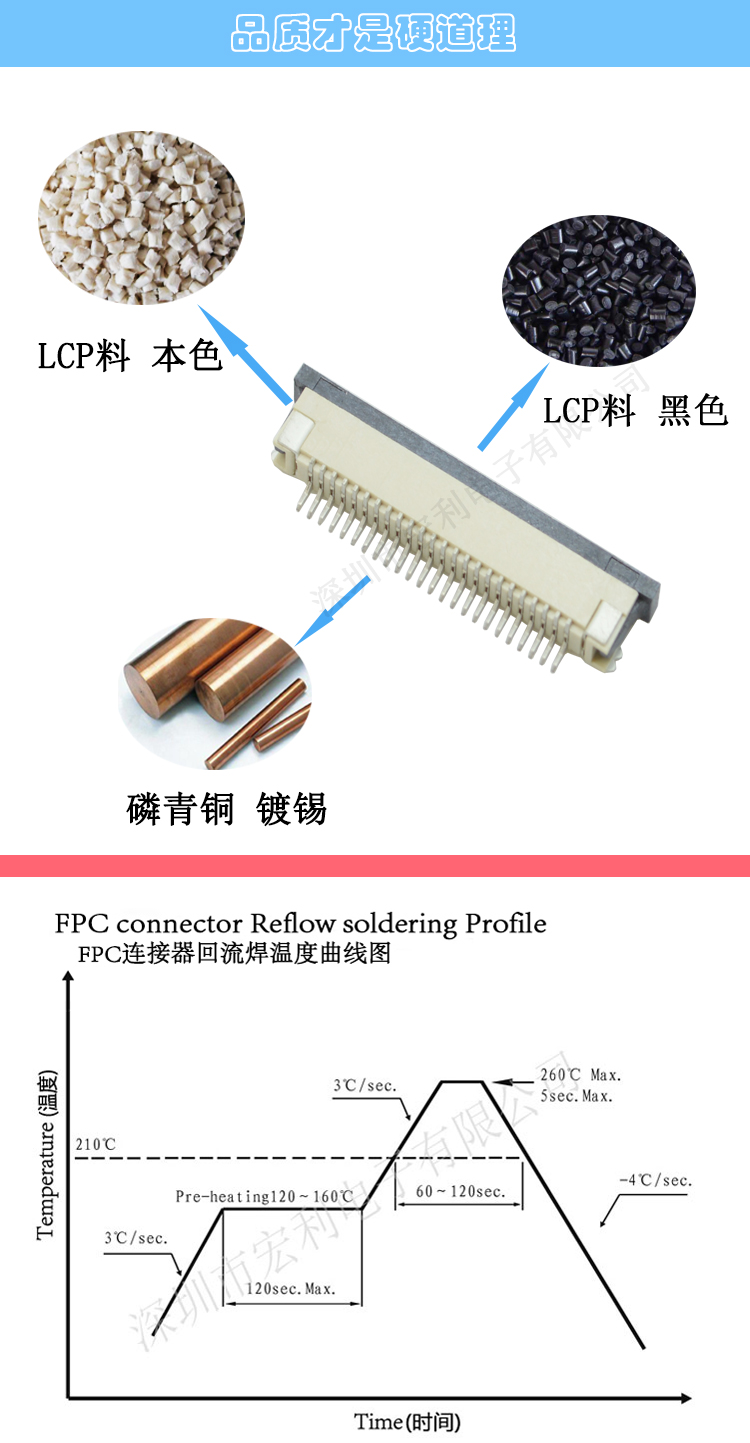 本公司一直以穩定可靠的產品質量與良好的經營信譽,取得了廣大客戶的信任.本公司所有的精密連接器產品均通過SGS環保測試.本公司主要產品有:0.3mm、 0.5mm 、0.8mm、1.0mm 、1.25mm、 1.5mm 、2.0MM、2.5mm、3.5mm間距連接器,(FPC排插),板對板 0.5mm 、0.8mm 間距連接器,共四十余種產品,上千種孔位,產品質量無飛邊,無毛刺,全部新料注塑,符合歐盟環保,孔位齊全,尺寸穩定,容易搭配,產品價格合理,如貴司有需要,可以隨時聯系我們,真誠希望能和貴司有合作的機會.產品廣泛用于:平板電腦、數碼相機、手機、讀卡機、打印機、功放音響、液晶電視、汽車音響、車載系統等領域及電腦周邊設備。