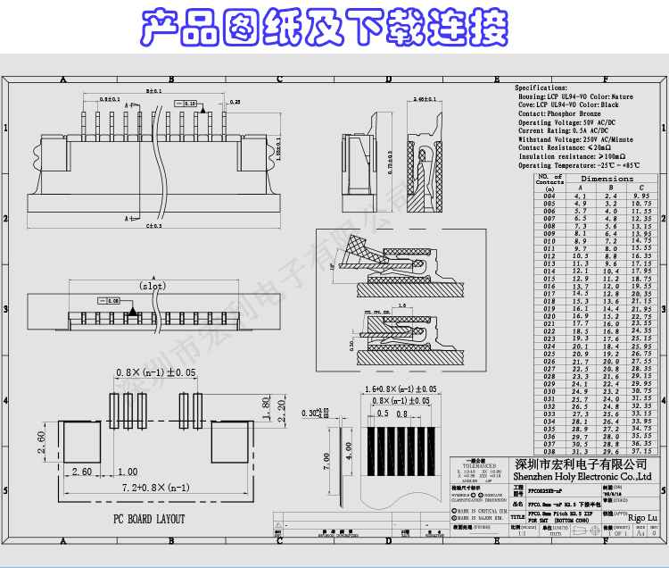 我司主要生產家電連接器,SMT貼片FPC連接器,產品規格從0.3mm、 0.5mm 、1.0mm 、1.25mm、 1.5mm 、2.0MM、2.5mm間距連接器,(FPC排插),板對板 0.5mm 、0.8mm 間距連接器,共四十余種產品,上千種孔位,產品質量無飛邊,無毛刺,全部新料注塑,符合歐盟環保,孔位齊全,尺寸穩定,容易搭配,產品價格合理,如貴司有需要,可以隨時聯系我們,真誠希望能和貴司有合作的機會,http://rigolu.cn.alibaba.com進入公司網址,點擊左側間距目錄可快速精確尋找貴司需要的產品。