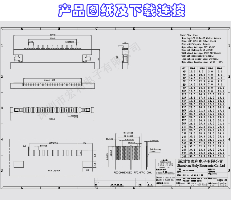 我司主要生產家電連接器,SMT貼片FPC連接器,產品規格從0.3mm、 0.5mm 、1.0mm 、1.25mm、 1.5mm 、2.0MM、2.5mm間距連接器,(FPC排插),板對板 0.5mm 、0.8mm 間距連接器,共四十余種產品,上千種孔位,產品質量無飛邊,無毛刺,全部新料注塑,符合歐盟環保,孔位齊全,尺寸穩定,容易搭配,產品價格合理,如貴司有需要,可以隨時聯系我們,真誠希望能和貴司有合作的機會,http://rigolu.cn.alibaba.com進入公司網址,點擊左側間距目錄可快速精確尋找貴司需要的產品。