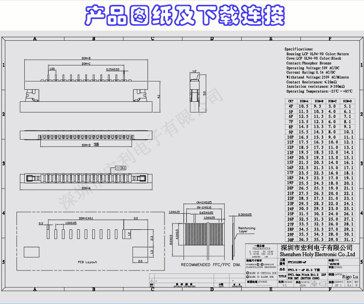 我司主要生產家電連接器,SMT貼片FPC連接器,產品規格從0.3mm、 0.5mm 、1.0mm 、1.25mm、 1.5mm 、2.0MM、2.5mm間距連接器,(FPC排插),板對板 0.5mm 、0.8mm 間距連接器,共四十余種產品,上千種孔位,產品質量無飛邊,無毛刺,全部新料注塑,符合歐盟環保,孔位齊全,尺寸穩定,容易搭配,產品價格合理,如貴司有需要,可以隨時聯系我們,真誠希望能和貴司有合作的機會,http://rigolu.cn.alibaba.com進入公司網址,點擊左側間距目錄可快速精確尋找貴司需要的產品。